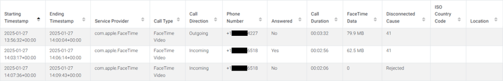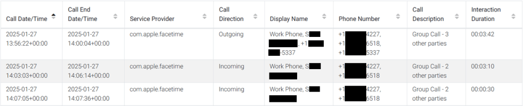 Through our testing and scripting, this data was also present within the interactionC.db – albeit the timeframe is not as long. The CallHistory.storedata data was present for just under two years, while the interactionC.db data was present for about six months within the reviewed dataset. Still, looking at the interactionC.db values for these same calls it serves as a validation of the CallHistory.storedata artifacts. Not all column data is stored in the interactionC.db and an example output for these same calls is as follows: